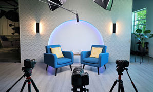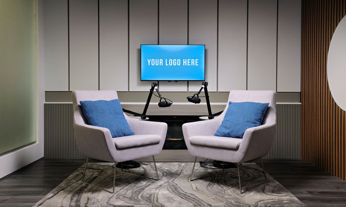Designed for video production, podcasting recording, corporate headshots and product photography, our space features three distinct sets: a cosy lounge with a fireplace, a reality-show-inspired space, and a clean, modern business setup perfect for interviews and thought leadership content. We also installed large seamless backdrops in a range of colours for headshots, portraits and green screen productions.